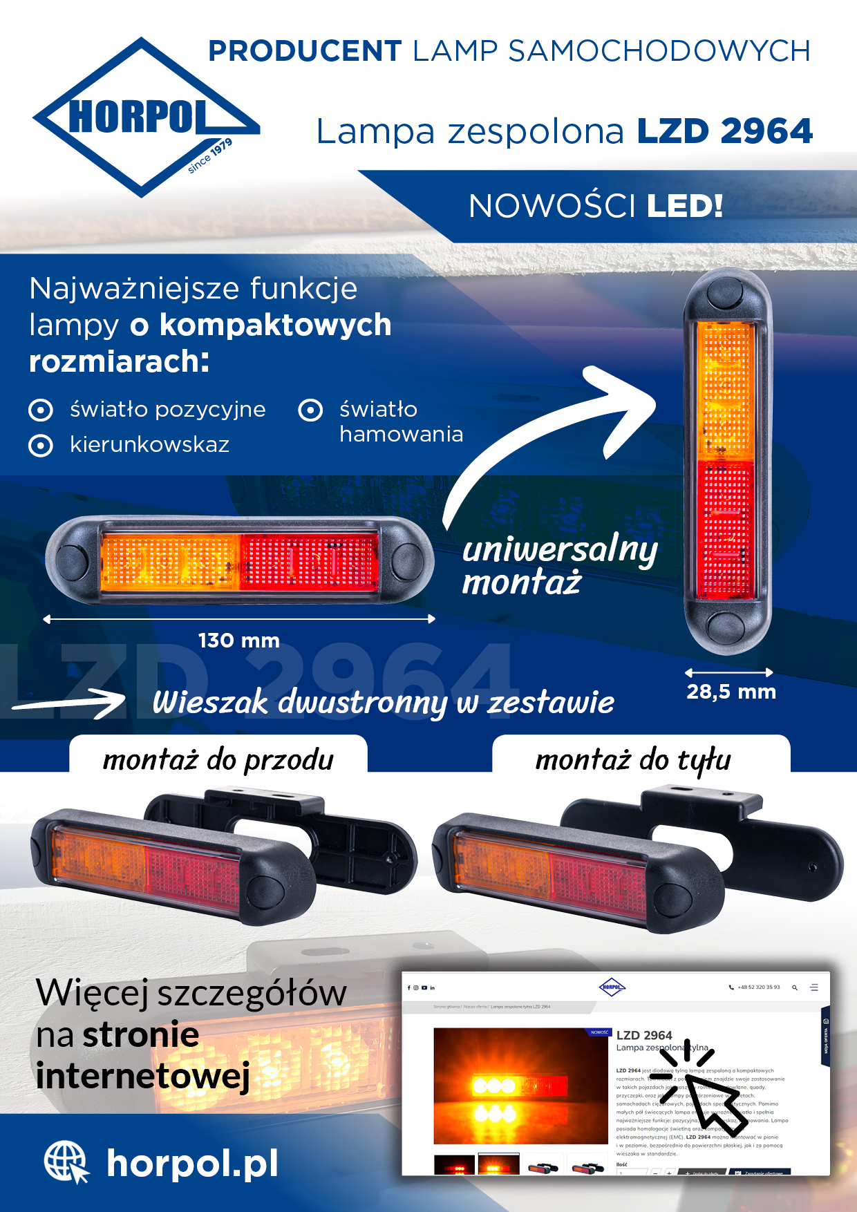 LZD 2964 es una luz trasera LED de dimensiones compactas. Este modelo se utilizará con éxito en vehículos como maquinaria agrícola, maquinaria de construcción, quads, remolques, así como luces repetidoras en grúas, camiones, y vehículos especializados. A pesar de sus reducidas mitades luminosas, esta luz emite una iluminación clara y desempeña las funciones más importantes: de posición, intermitente y de freno. La luz dispone de homologaciones de luz y de compatibilidad electromagnética (CEM). LZD 2964 puede montarse en posición vertical y horizontal, tanto directamente sobre una superficie plana como con un colgador estándar.