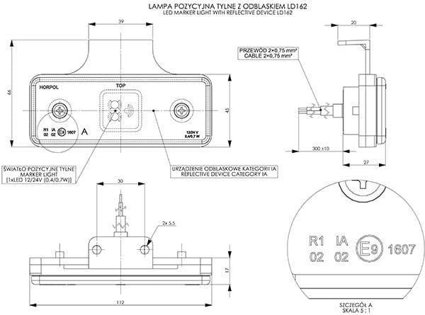 Luz de gálibo rectangular con reflejo, roja, con colgador con fijación detrás de la luz.