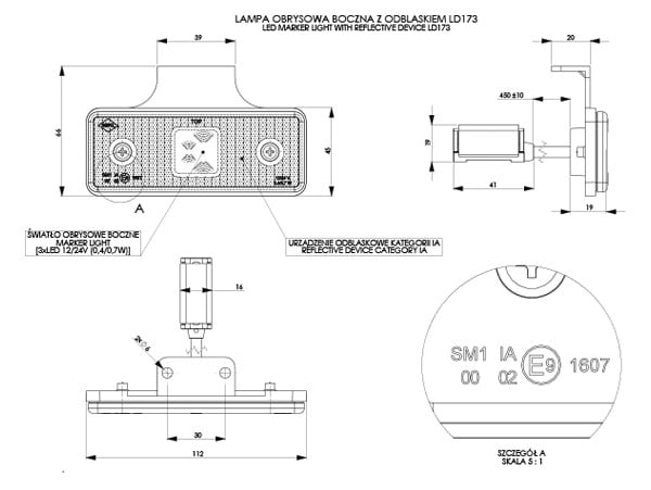Luz de gálibo rectangular con reflejo, naranja, con colgador y collar.